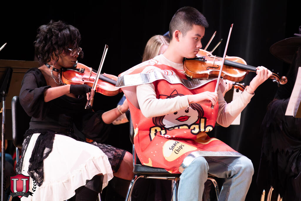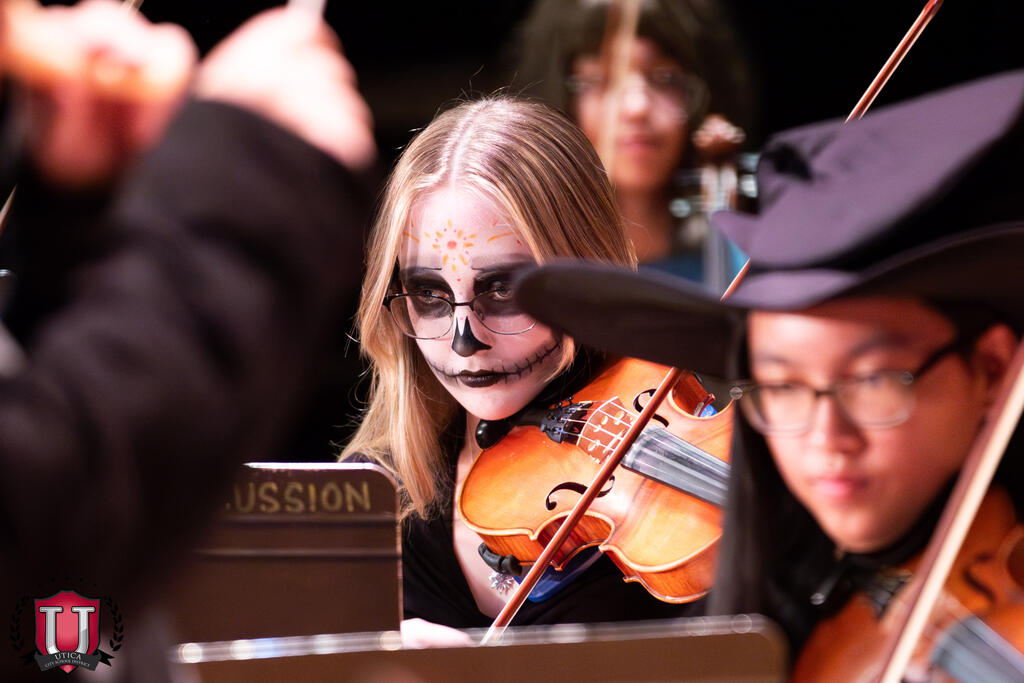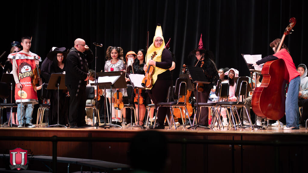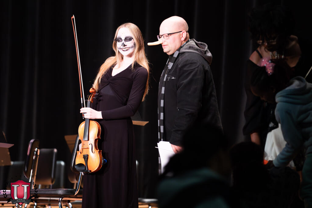 Bilo je nekih muzičkih trikova i poslastica na sinoćnjem kostimiranom koncertu u Auditorijumu srednje škole Proctor. Koncert je vodio gospodin Kishman (koji se obrušio kao Gru), i Proctor Orchestra i Proctor Simfonijski orkestar nosili su svoje zastrašujuće sjajne kostime i svirali neku proganjajuće sezonsku muziku, uključujući i svima omiljenu, temu porodice Addams!